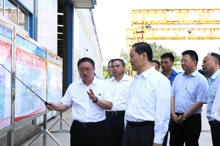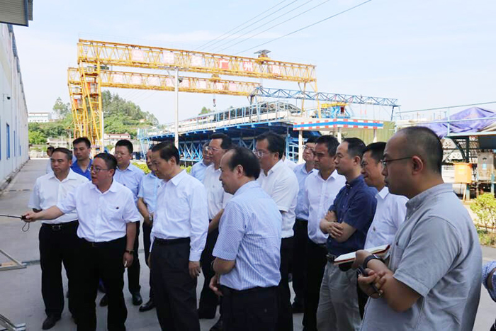 彭清华等领导一行实地察看了自贡制梁场施工现场,唐云向彭清华等领导介绍了箱梁预制的工序工艺流程和箱梁架梁的“搬、提、运、架”施工流程,对中铁广州局为川南城际铁路做出的贡献表示赞赏,对中铁广州局主动地融入四川、服务四川、建设四川,为推动治蜀兴川再上新台阶作出的贡献表示感谢。彭清华说,当前四川省正处在转型发展、创新发展、跨越发展的关键时期,中铁广州局川南城际项目部要抢抓机遇,以“主人翁”角色,自觉置身于四川经济社会发展大局,思考谋划相关工作,要充分发挥中国中铁作为中央企业的社会担当精神,当好川南城际铁路建设的排头兵,干好现有工程,为进一步完善四川铁路交通网建设、提升四川铁路枢纽地位做出积极贡献。